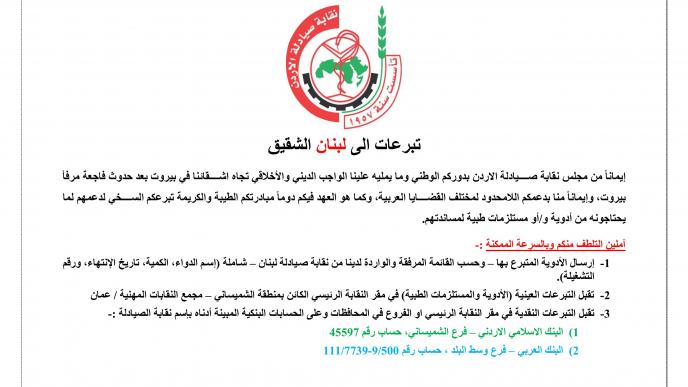 الأخبار ٨ أغسطس ٢٠٢٠ تبرعات الى لبنان الشقيق تبرعات الى لبنان الشقيق قوائم الادوية المطلوبة الواردة من نقابة صيادلة لبنان