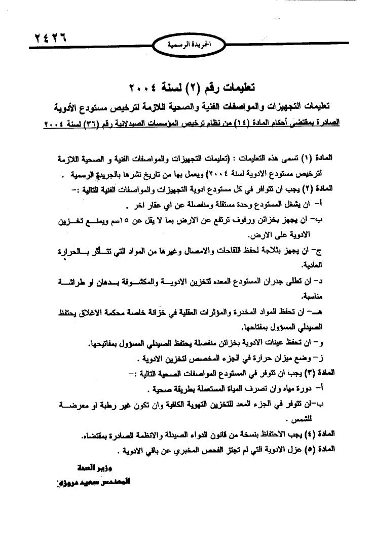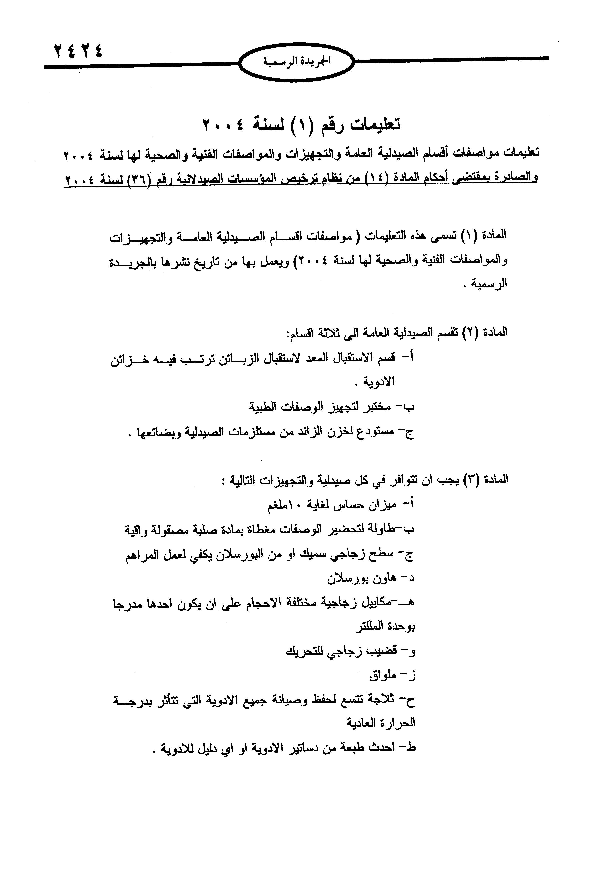 - تعليمات مواصفات اقسام الصيدلية العامة و التجهيزات و المواصفات الفنية و الصحية لها لسنة 2004.